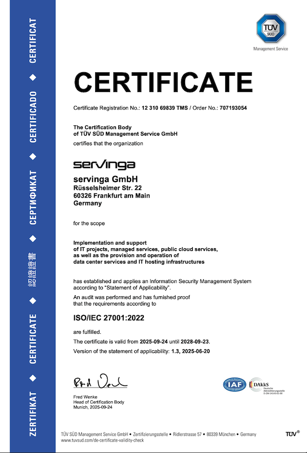 At servinga, we understand that security and data protection are crucial for your business. As a German cloud hosting provider, we rely on the highest security standards and transparent processes. Our certifications demonstrate our commitment to protecting your data and infrastructure.